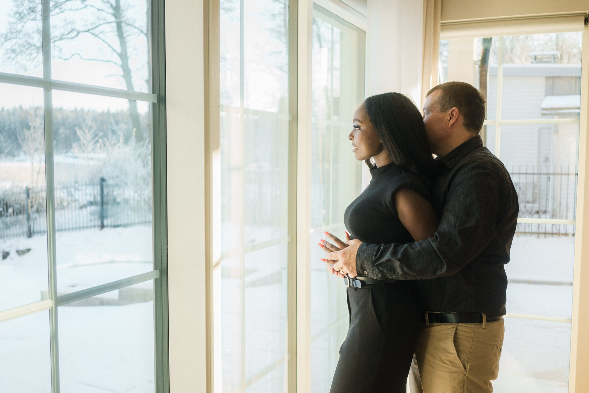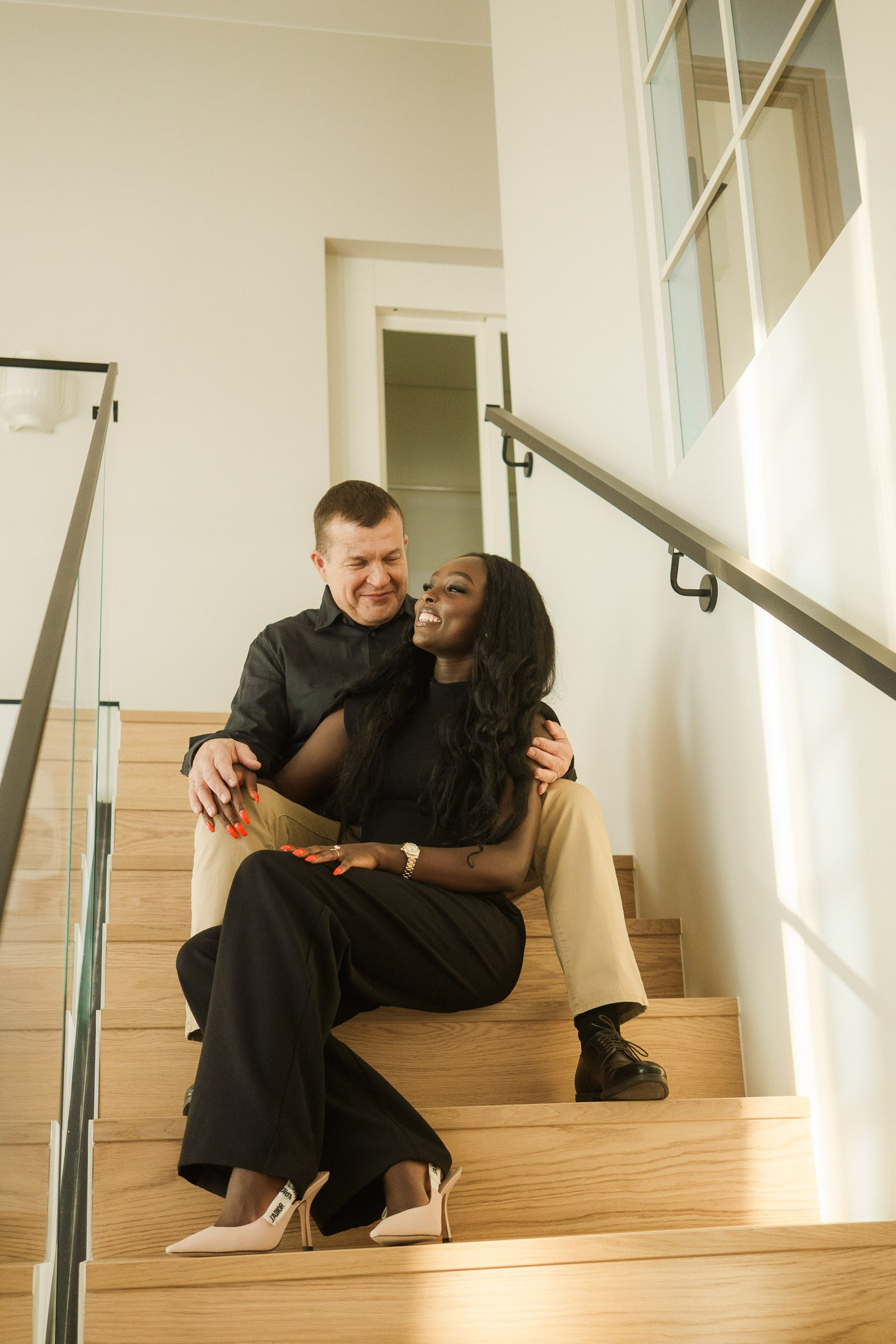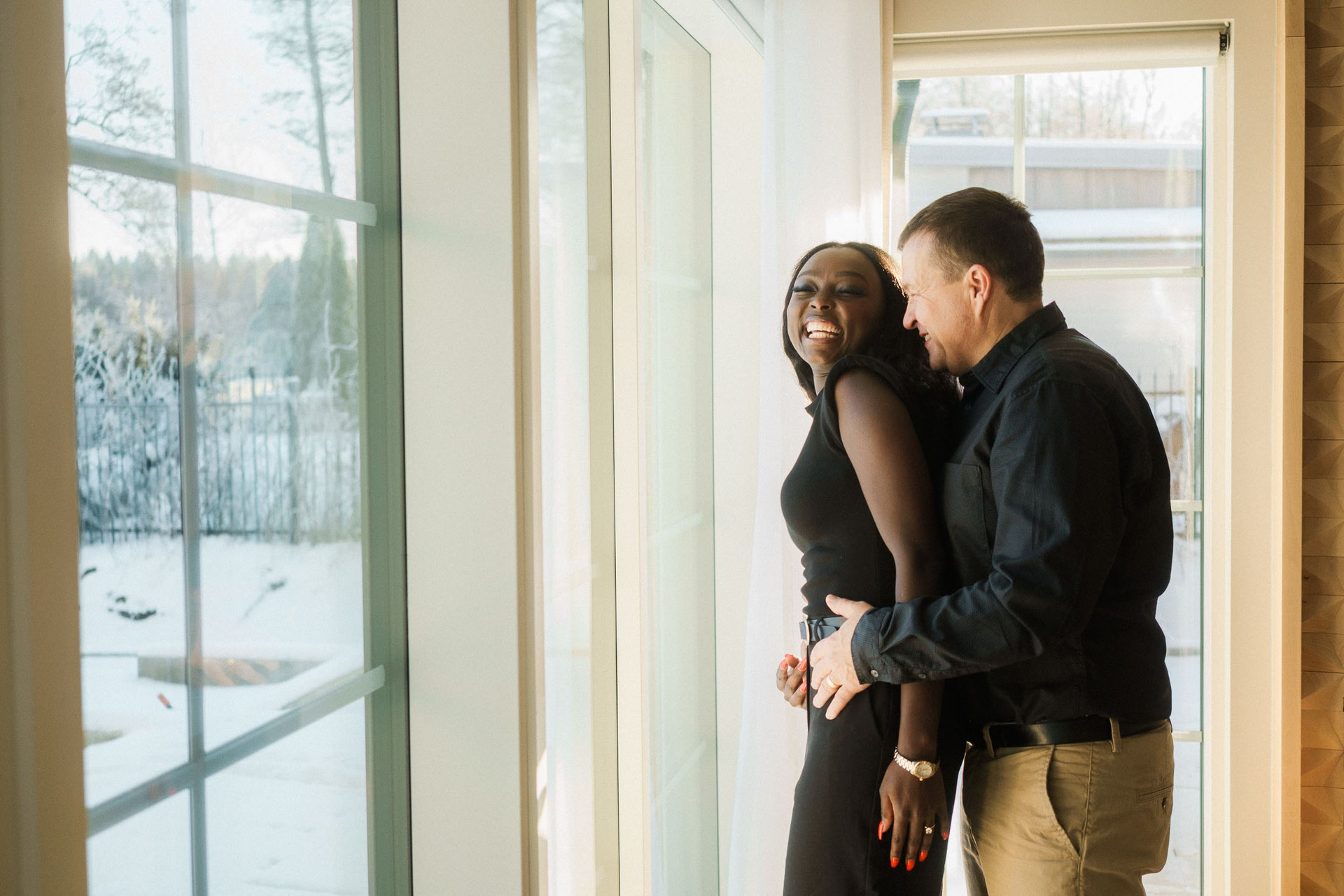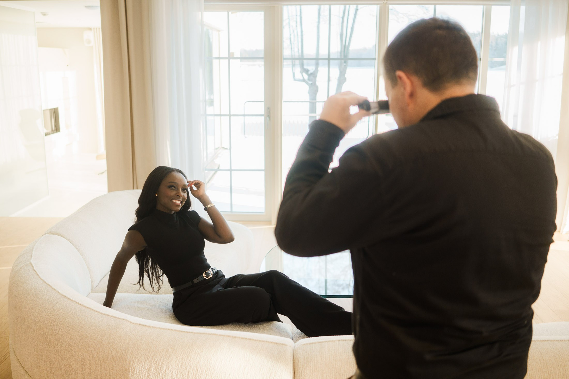 Aloitimme kuvauksen sisällä, missä suuret ikkunat päästivät sisään pehmeän, talvisen valon. Keskityimme niihin aitoihin, pieniin hetkiin: käpertymiseen sohvan nurkkaan, katseisiin portailla ja siihen hiljaiseen läheisyyteen, jota on vain kotona. Ei kiirettä, ei suorittamista. Vain he kaksi.