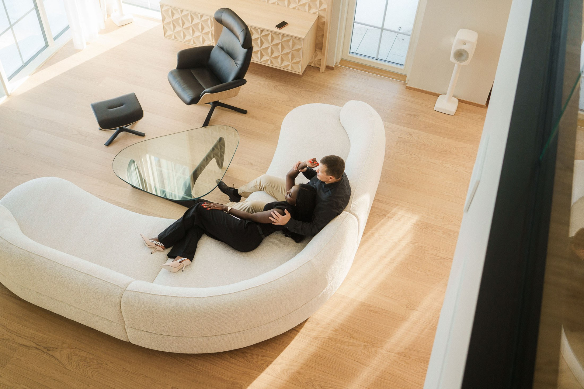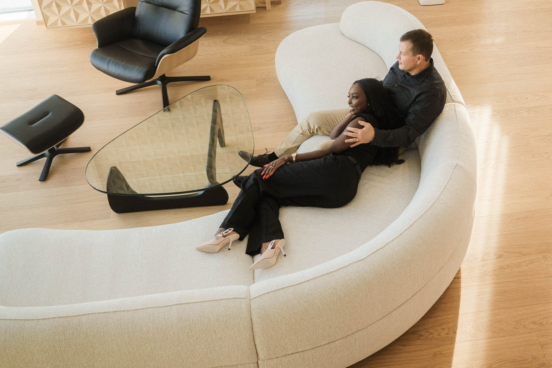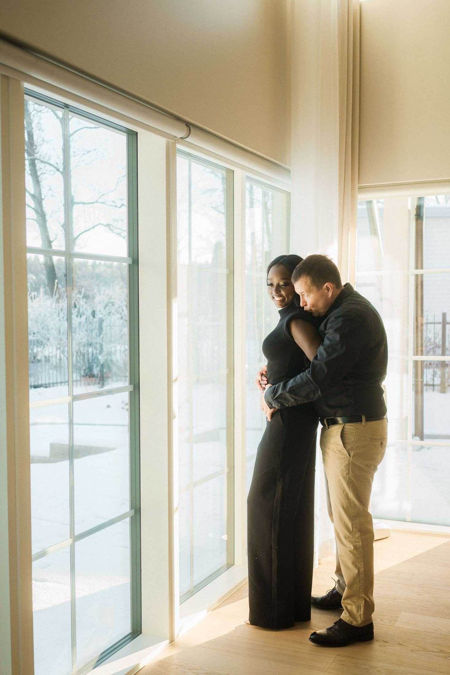 Aloitimme kuvauksen sisällä, missä suuret ikkunat päästivät sisään pehmeän, talvisen valon. Keskityimme niihin aitoihin, pieniin hetkiin: käpertymiseen sohvan nurkkaan, katseisiin portailla ja siihen hiljaiseen läheisyyteen, jota on vain kotona. Ei kiirettä, ei suorittamista. Vain he kaksi.