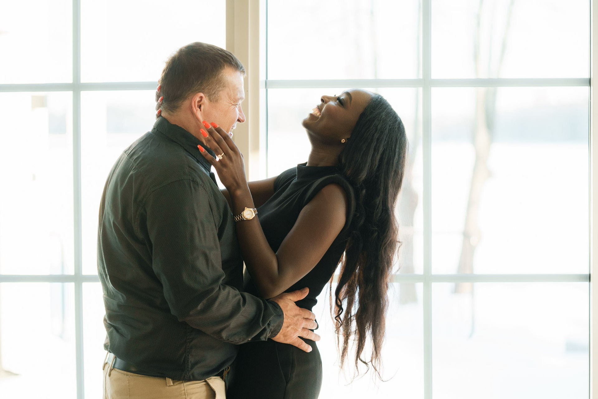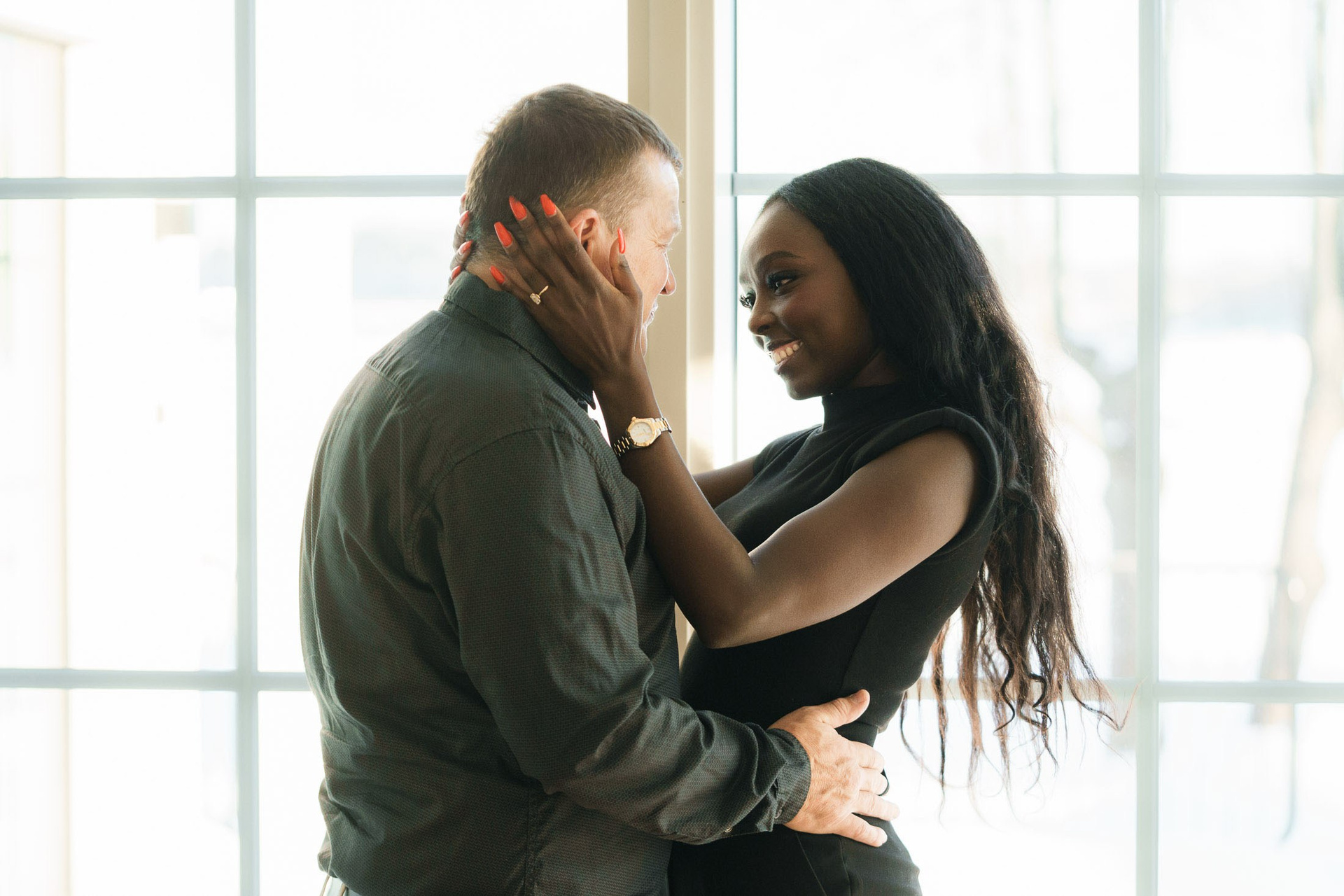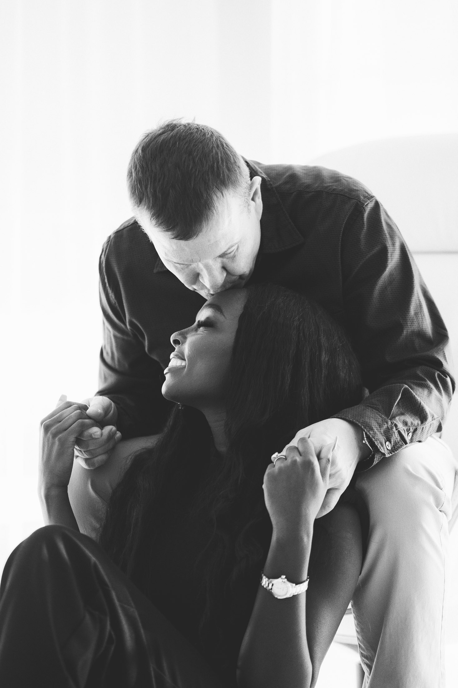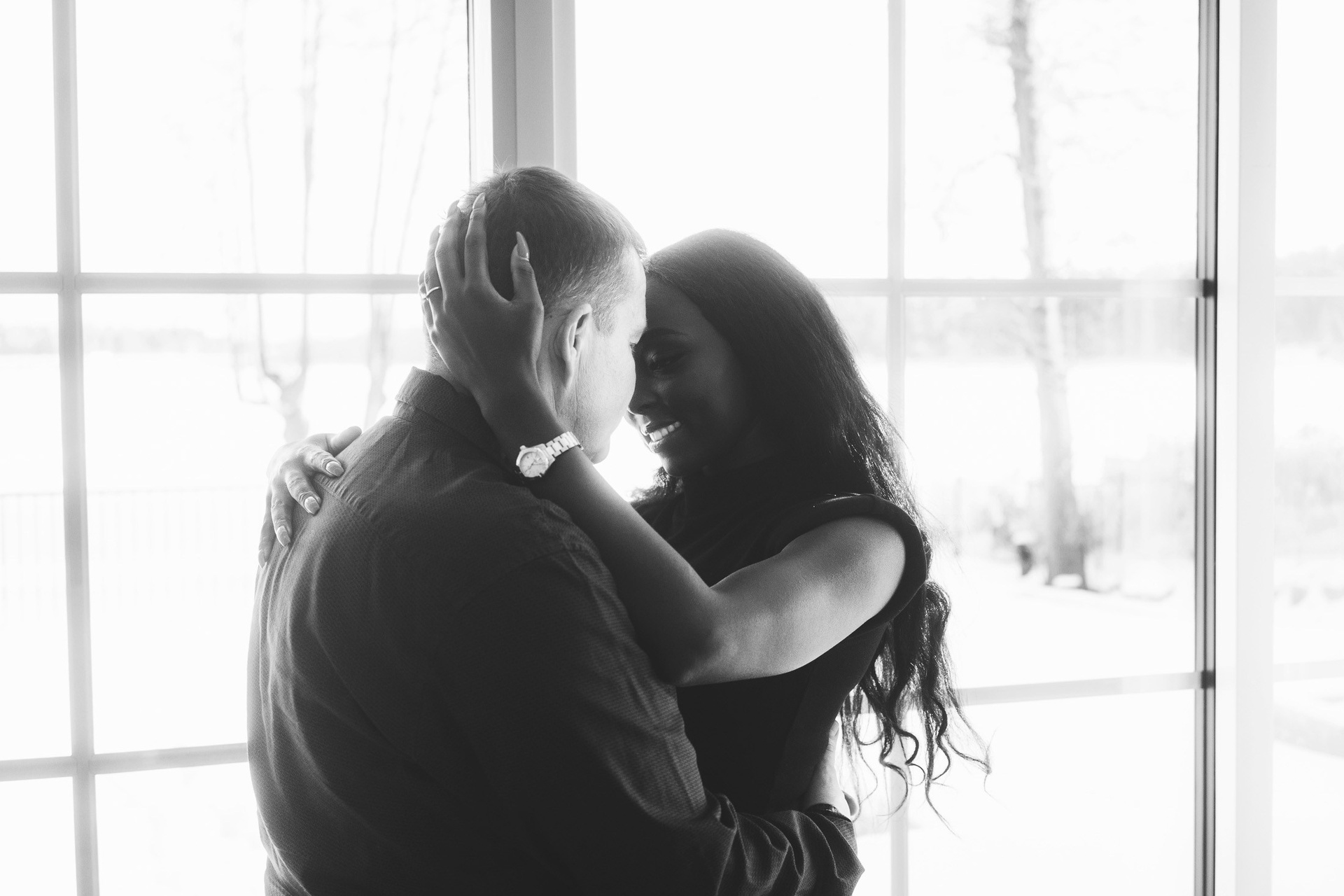 Aloitimme kuvauksen sisällä, missä suuret ikkunat päästivät sisään pehmeän, talvisen valon. Keskityimme niihin aitoihin, pieniin hetkiin: käpertymiseen sohvan nurkkaan, katseisiin portailla ja siihen hiljaiseen läheisyyteen, jota on vain kotona. Ei kiirettä, ei suorittamista. Vain he kaksi.