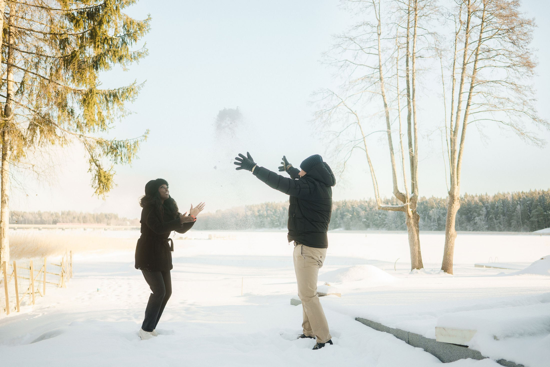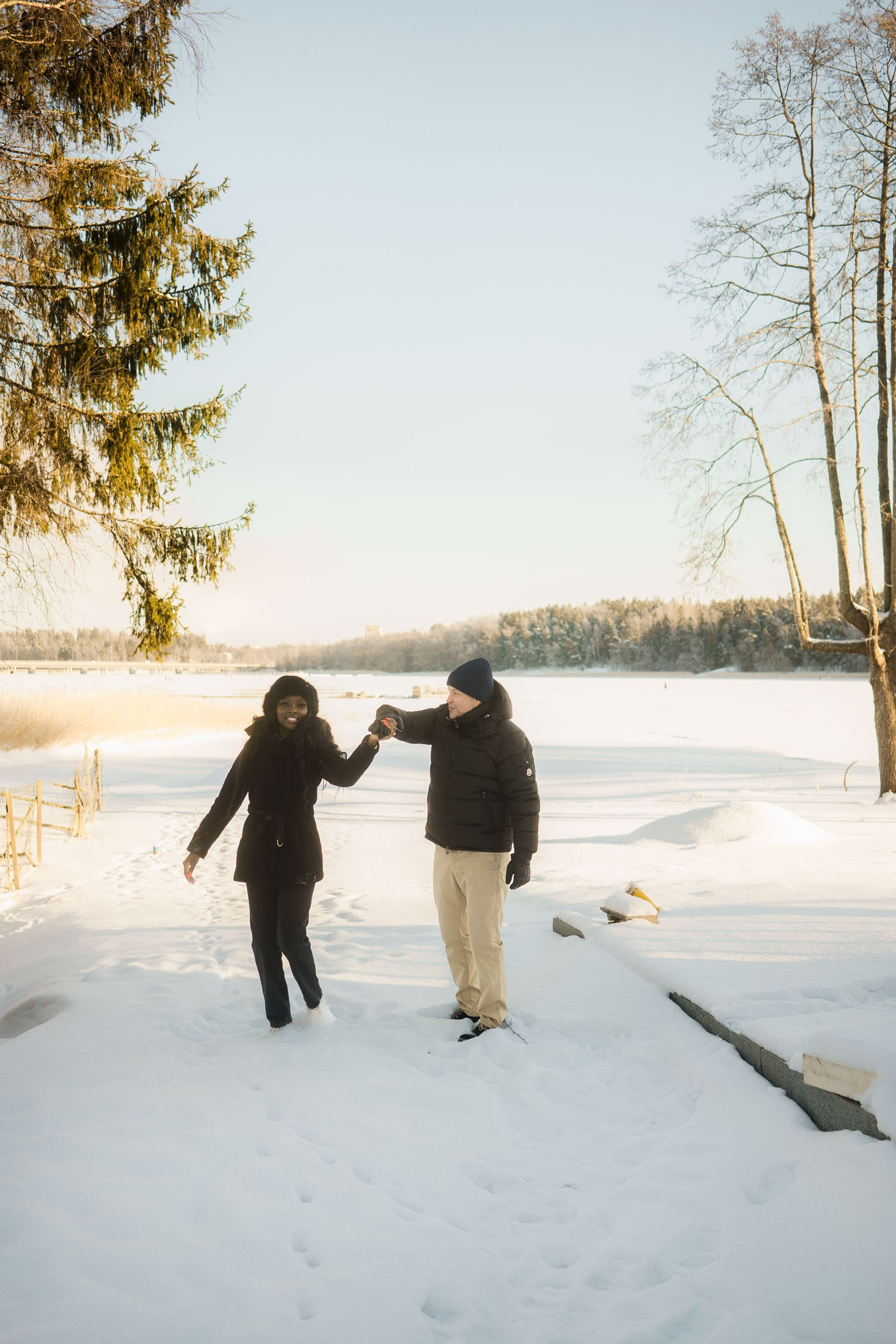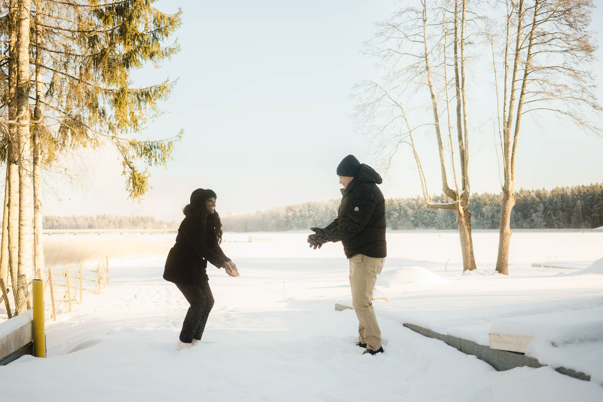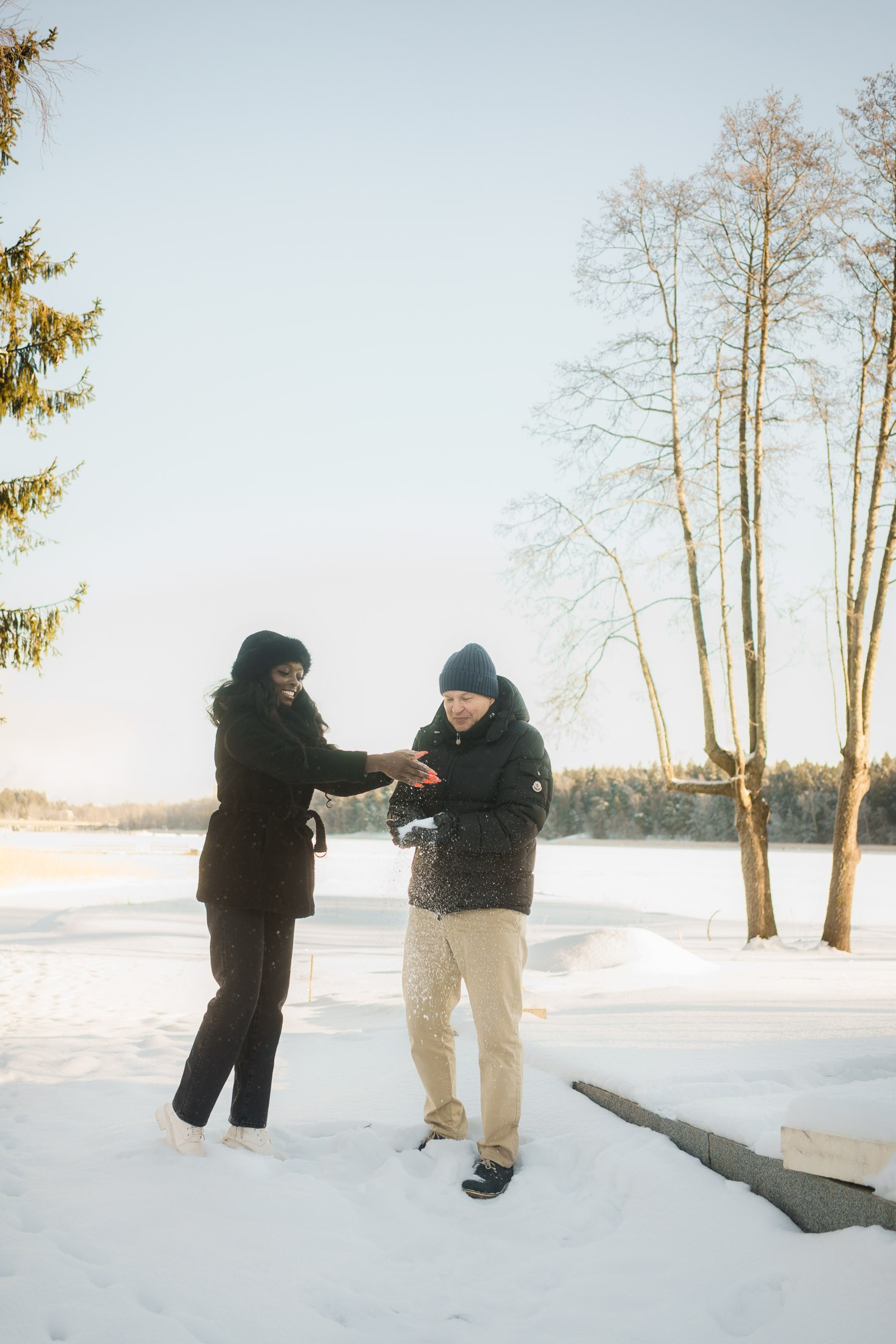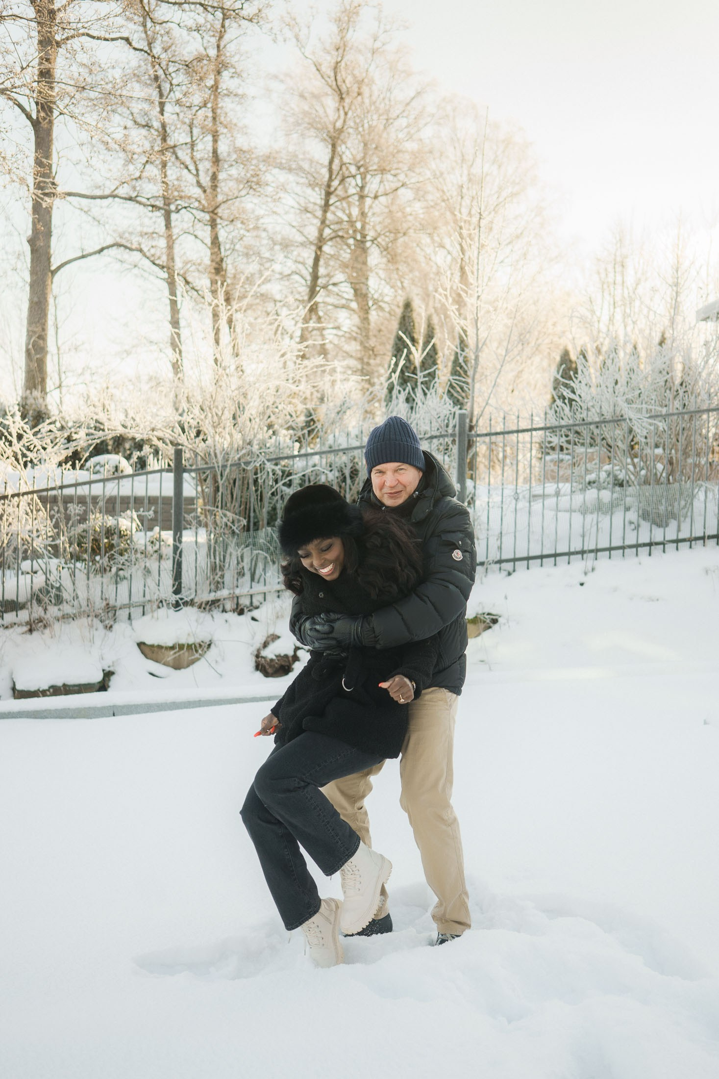 Sen jälkeen vedimme takit niskaan ja suuntasimme ulos lumiseen pakkassäähän. Raikas talvi-ilma ja valkoinen hanki toivat kuviin aivan uudenlaista energiaa ja leikkisyyttä. Rakastan tätä kontrastia – sitä, miten ulkona jaettu nauru ja sisällä jaettu rauha täydentävät toisiaan luoden kokonaisen tarinan.