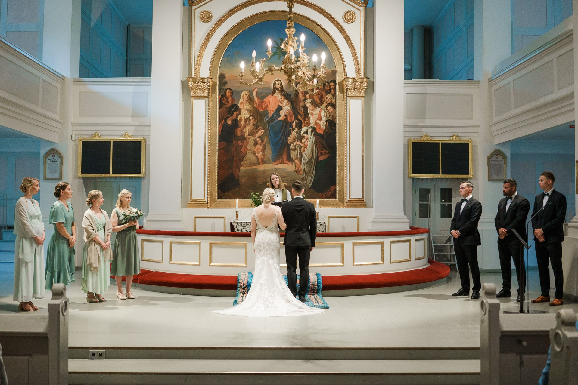 Kun vihdoin siirryimme Helsingin vanhaan kirkkoon vihkimisen ajaksi, tunnelma oli syvä ja juhlallinen. Kirkon upeat yksityiskohdat ja historiallinen arvokkuus loivat mahtavan taustan Mirkan ja Petruksen liikuttavalle lupaukselle rakkaudestaan toisilleen.