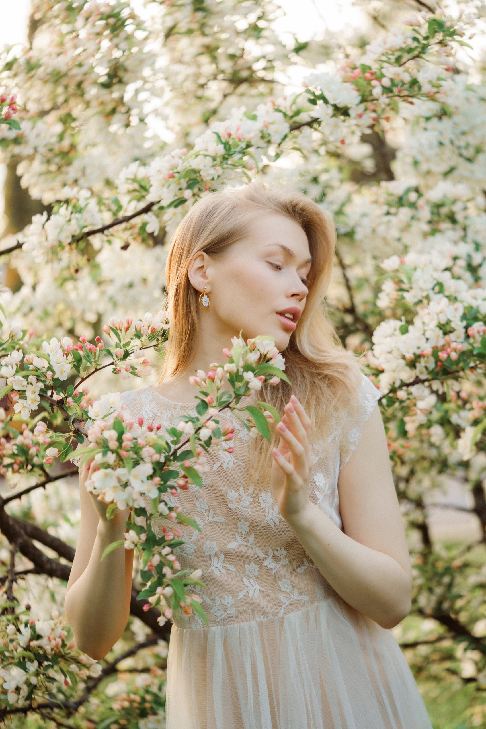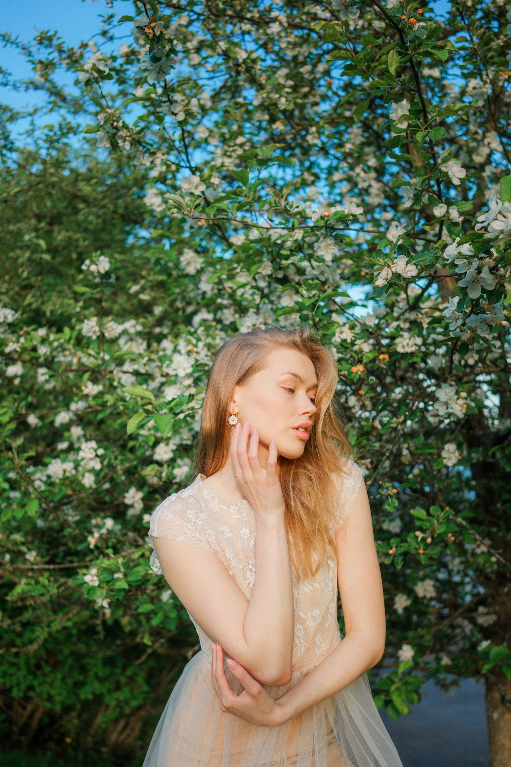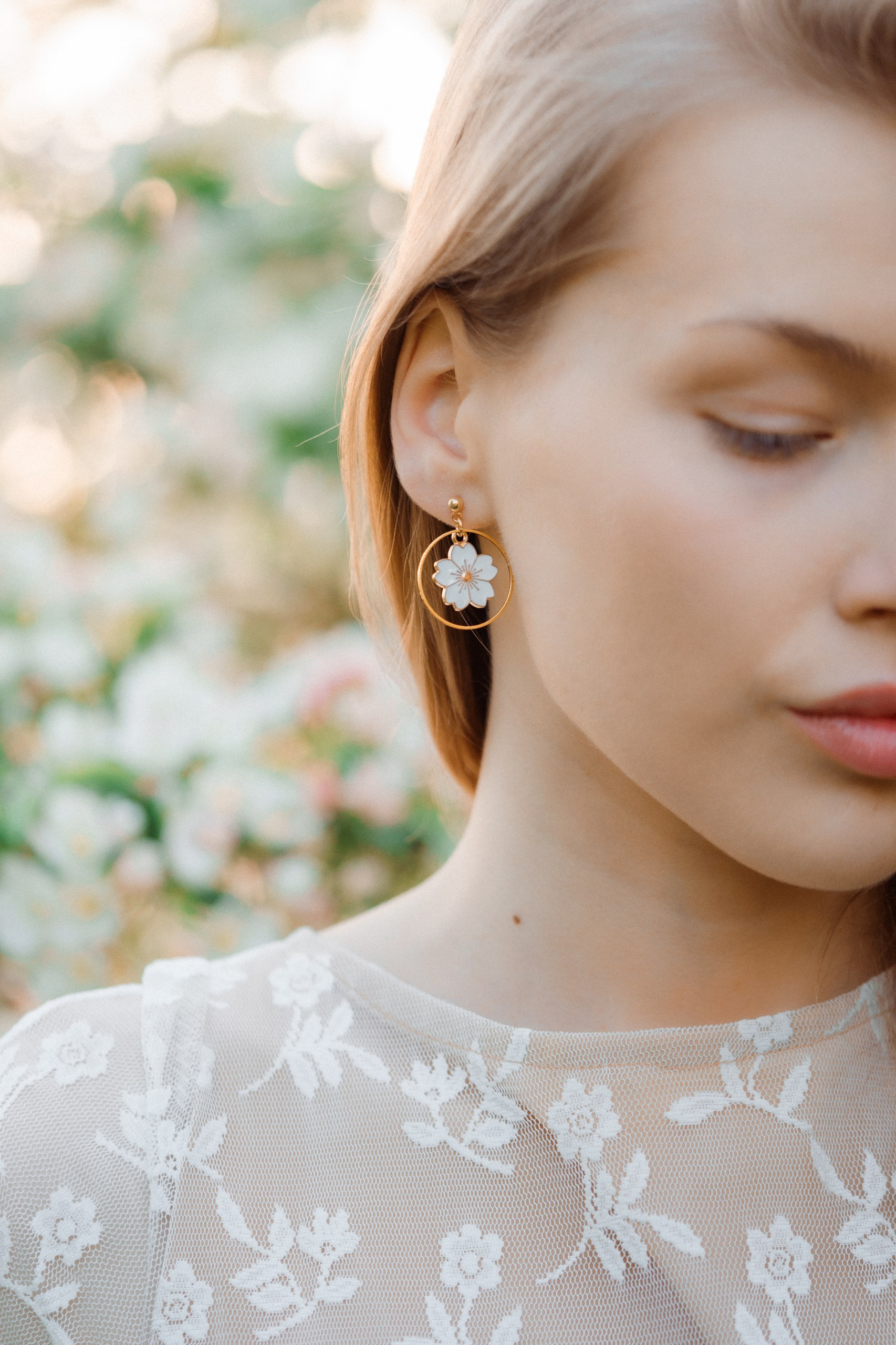 Päätimme toteuttaa brändikuvauksen kukkivien omenapuiden keskellä, hyödyntäen iltaisen auringonlaskun kultaista valoa. Tuotekuvauksessa valaistus on kaikki kaikessa, ja luonnonvalo tarjoaa siihen parhaan mahdollisen pohjan. Iltaauringon pehmeät säteet loivat täydellisen, lämpimän tunnelman, joka toi esiin korujen yksityiskohdat kauniisti.