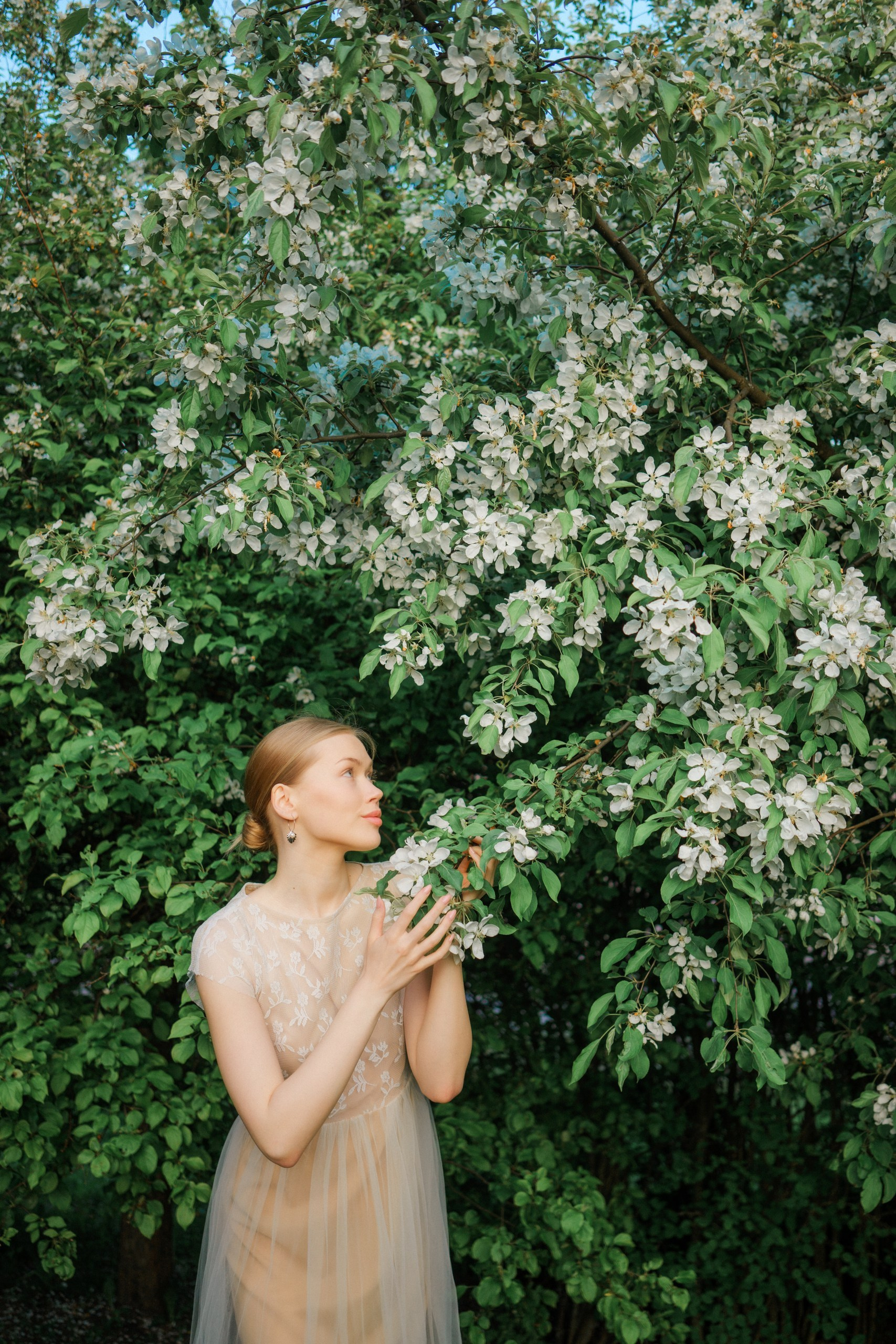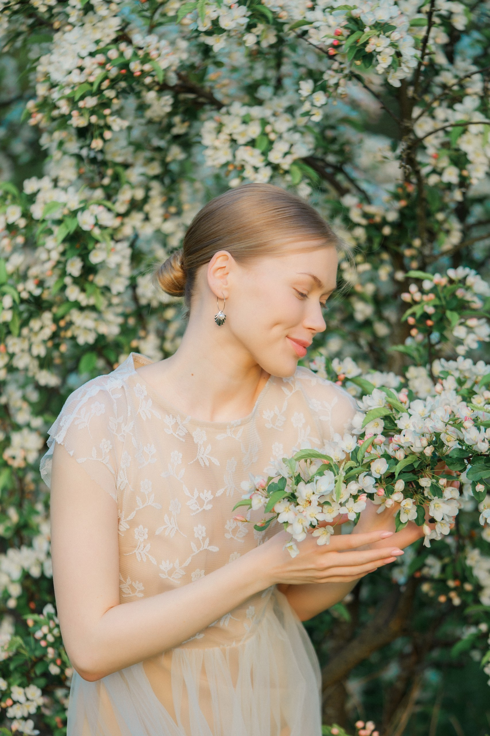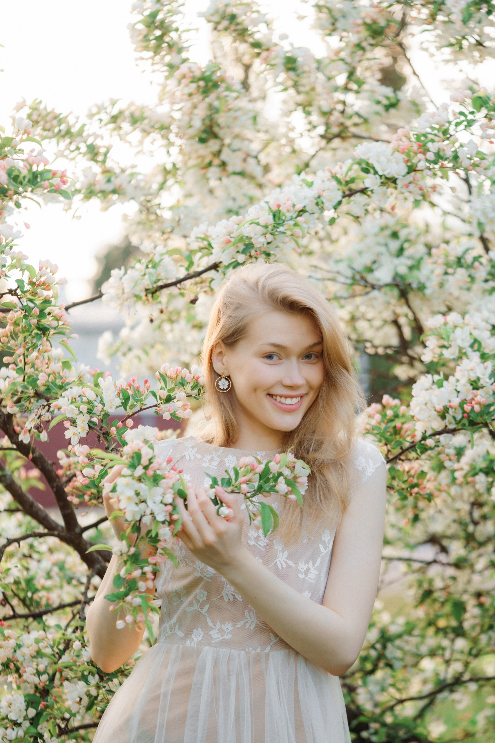 Hyvä brändikuvaus ei ole pelkästään tuotteen kuvaamista, se kertoo tarinan ja luo tunnelman. Tässä kuvauksessa halusin yhdistää Sinnakorun korujen hienostuneisuuden kevyen, kesäisen estetiikan kanssa. Valkoiset omenankukat toimivat täydellisenä taustana, luoden romanttisen ja satumaisen tunnelman, joka sopii brändille erinomaisesti. Erityisen kiehtovaa oli se, että kuvattavana oli kaksi erilaista korumallia: kauniit helmet simpukankuoren muotoisilla riipuksilla ja toinen upea omenankukan muotoinen koru. Kukkivien omenapuiden ympäristö loi täydellisen yhteyden omenankukka-korun kanssa. Muotoilu ja luonto kohtasivat harmonisesti.