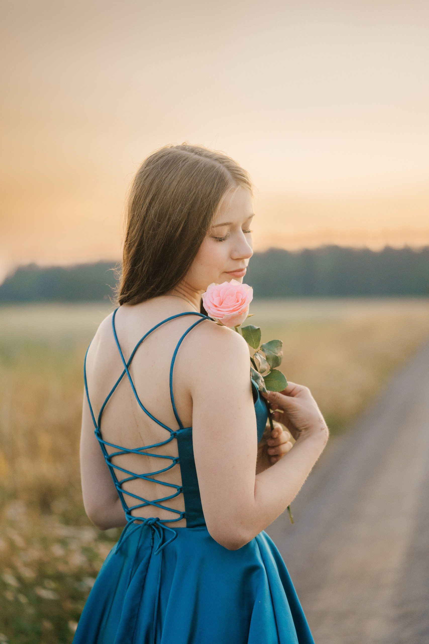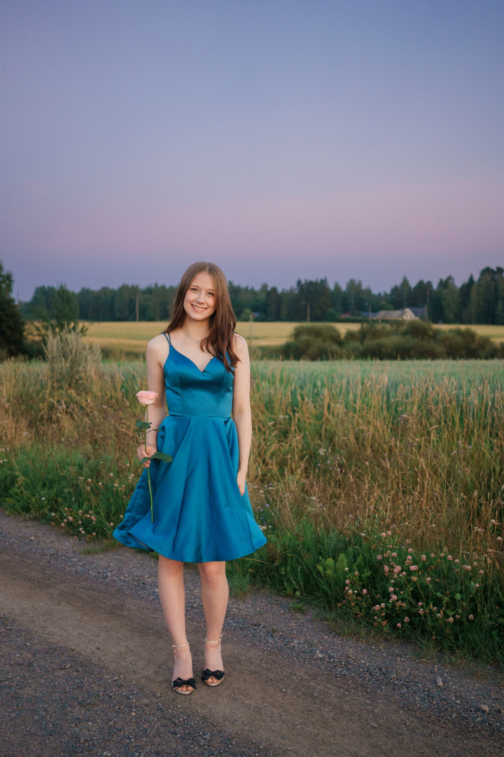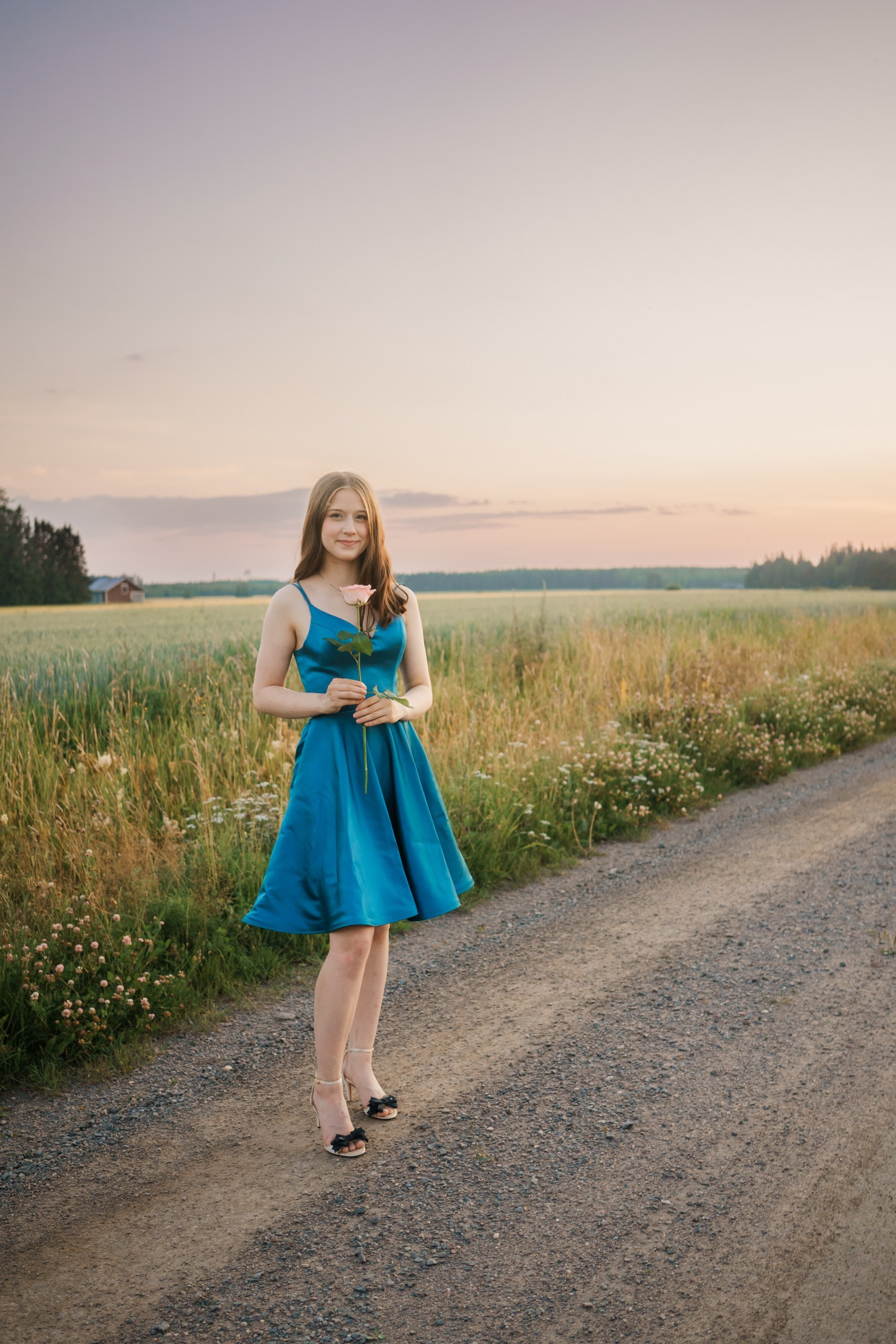 Kun olimme saaneet upeat yhteiskuvat hevosen kanssa, siirryimme vielä läheiselle hiekkatietelle kuvaamaan varsinaisia yksilöpotretteja. Ilta-aurinko (niin sanottu ”Golden Hour”) alkoi juuri laskea, värjäten taivaan pehmeillä pastellin ja violetin sävyillä.