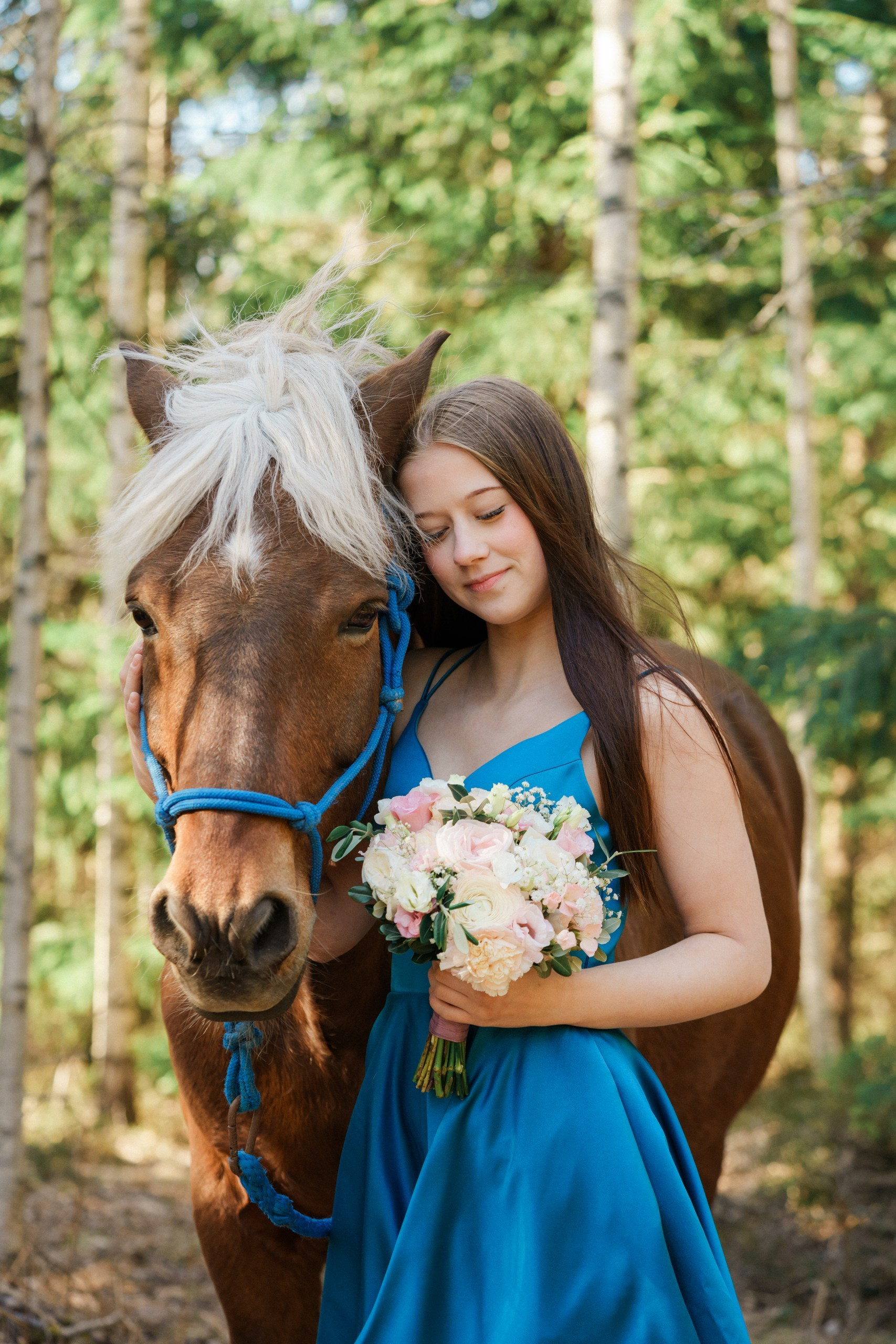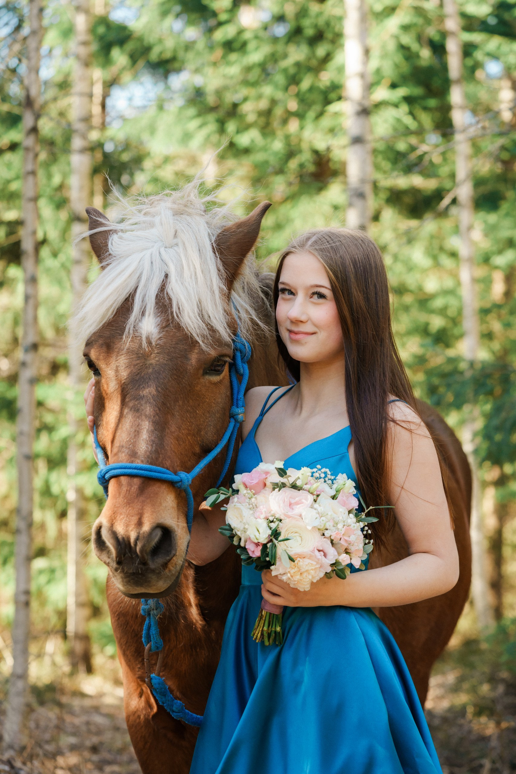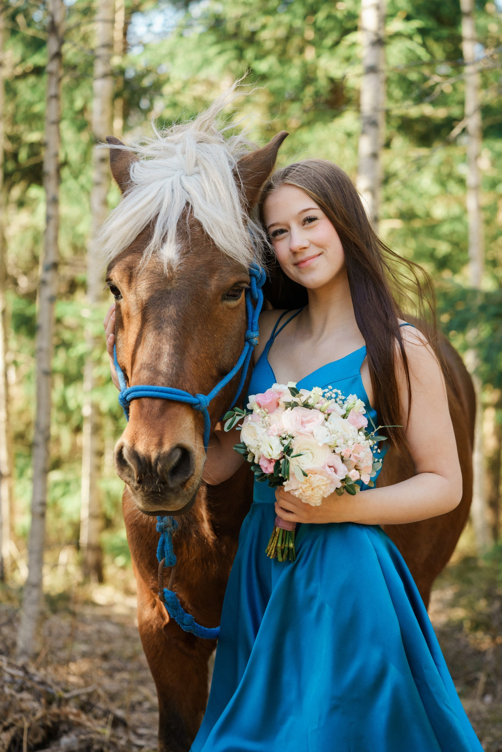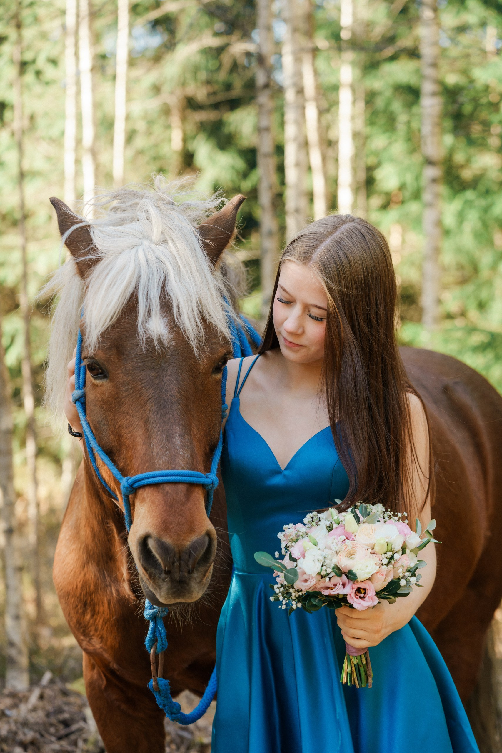Toteutimme tämän rippikuvauksen Sipoon kauniissa metsä- ja maalaismaisemissa. Kuvaus aloitettiin metsän siimeksessä, jossa auringonsäteet siivilöityivät puiden oksien läpi. Nuoren upea, syvän sininen mekko loi täydellisen ja näyttävän kontrastin vihreää metsää ja hevosen lämpimän ruskeaa karvaa vasten.