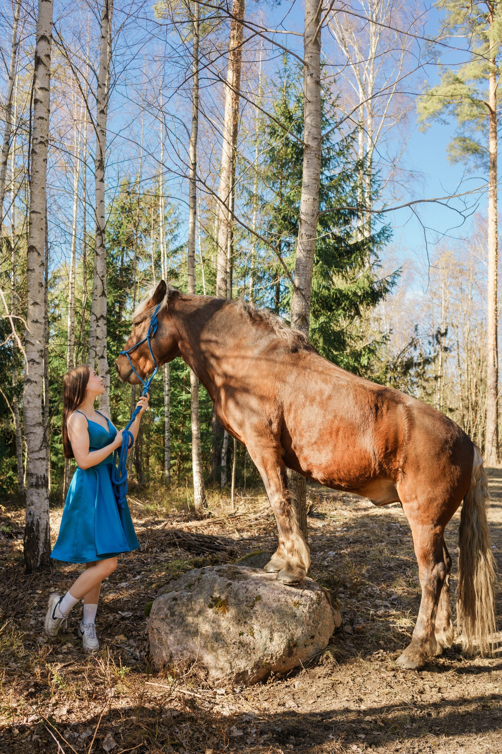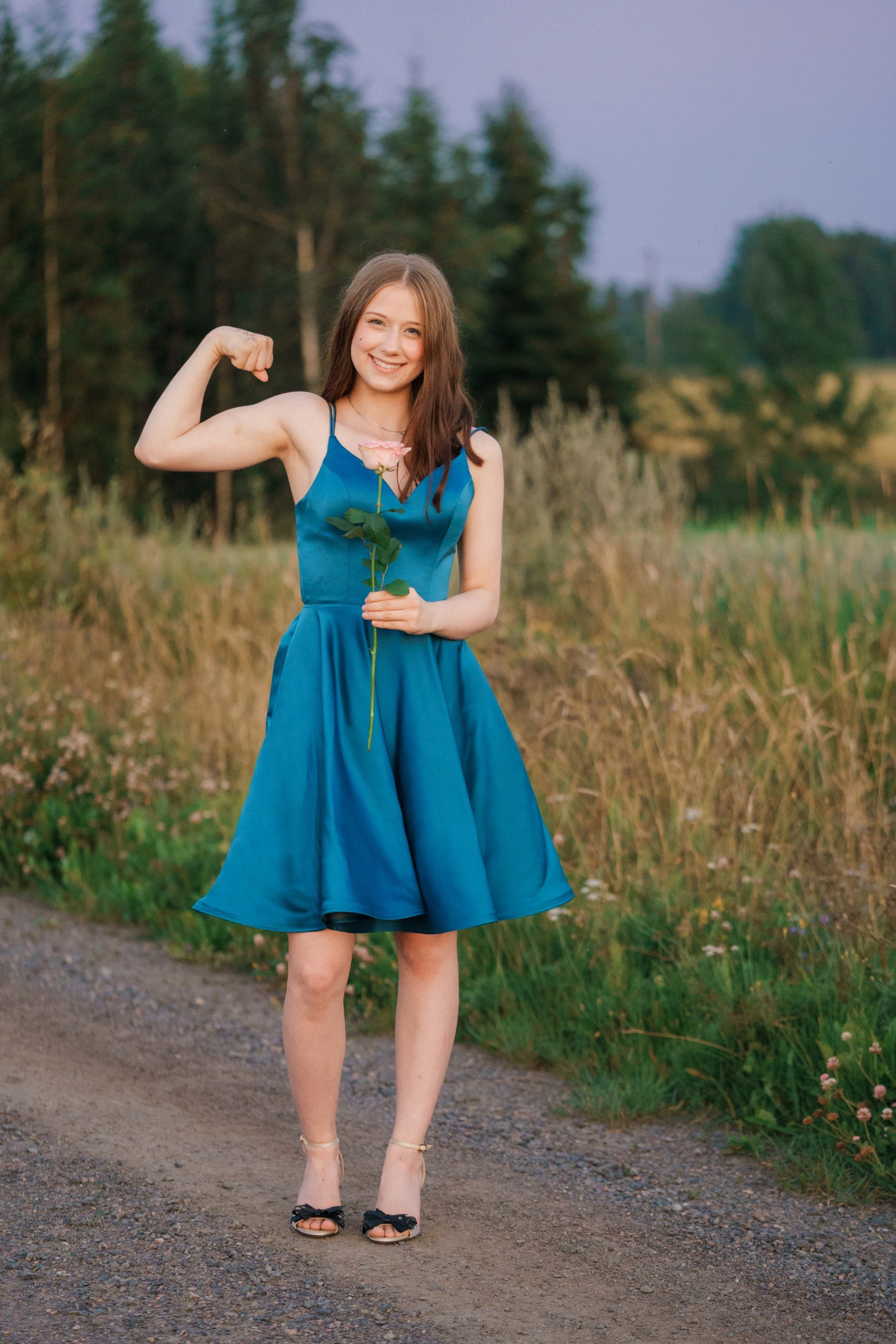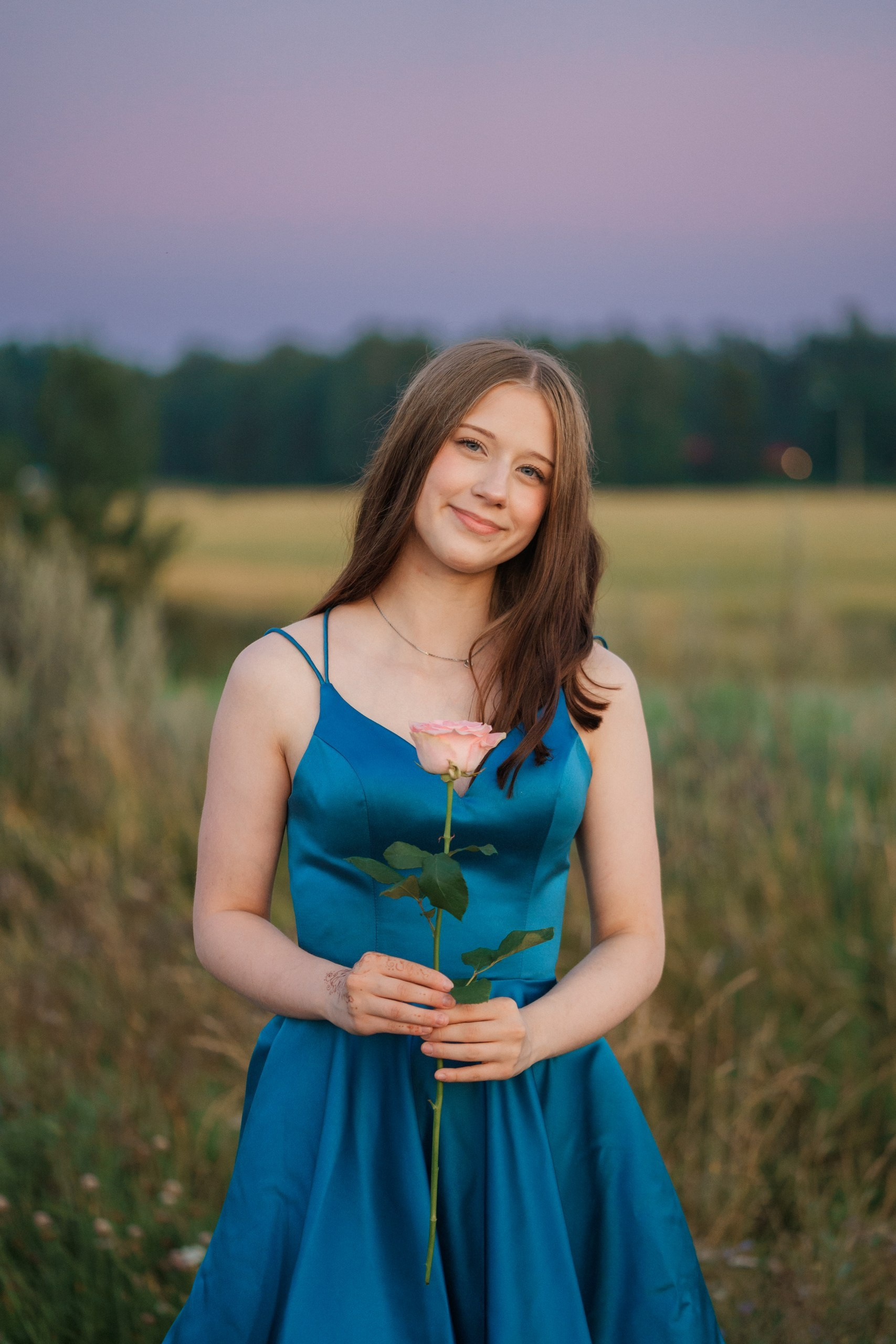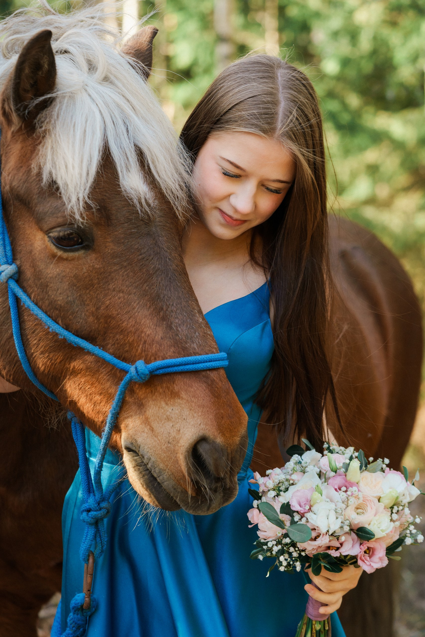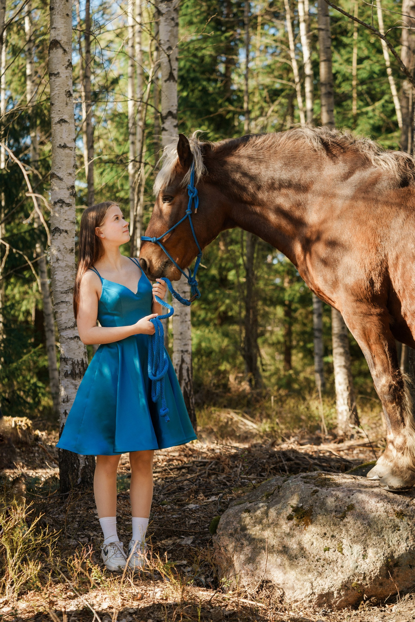Toteutimme tämän rippikuvauksen Sipoon kauniissa metsä- ja maalaismaisemissa. Kuvaus aloitettiin metsän siimeksessä, jossa auringonsäteet siivilöityivät puiden oksien läpi. Nuoren upea, syvän sininen mekko loi täydellisen ja näyttävän kontrastin vihreää metsää ja hevosen lämpimän ruskeaa karvaa vasten.