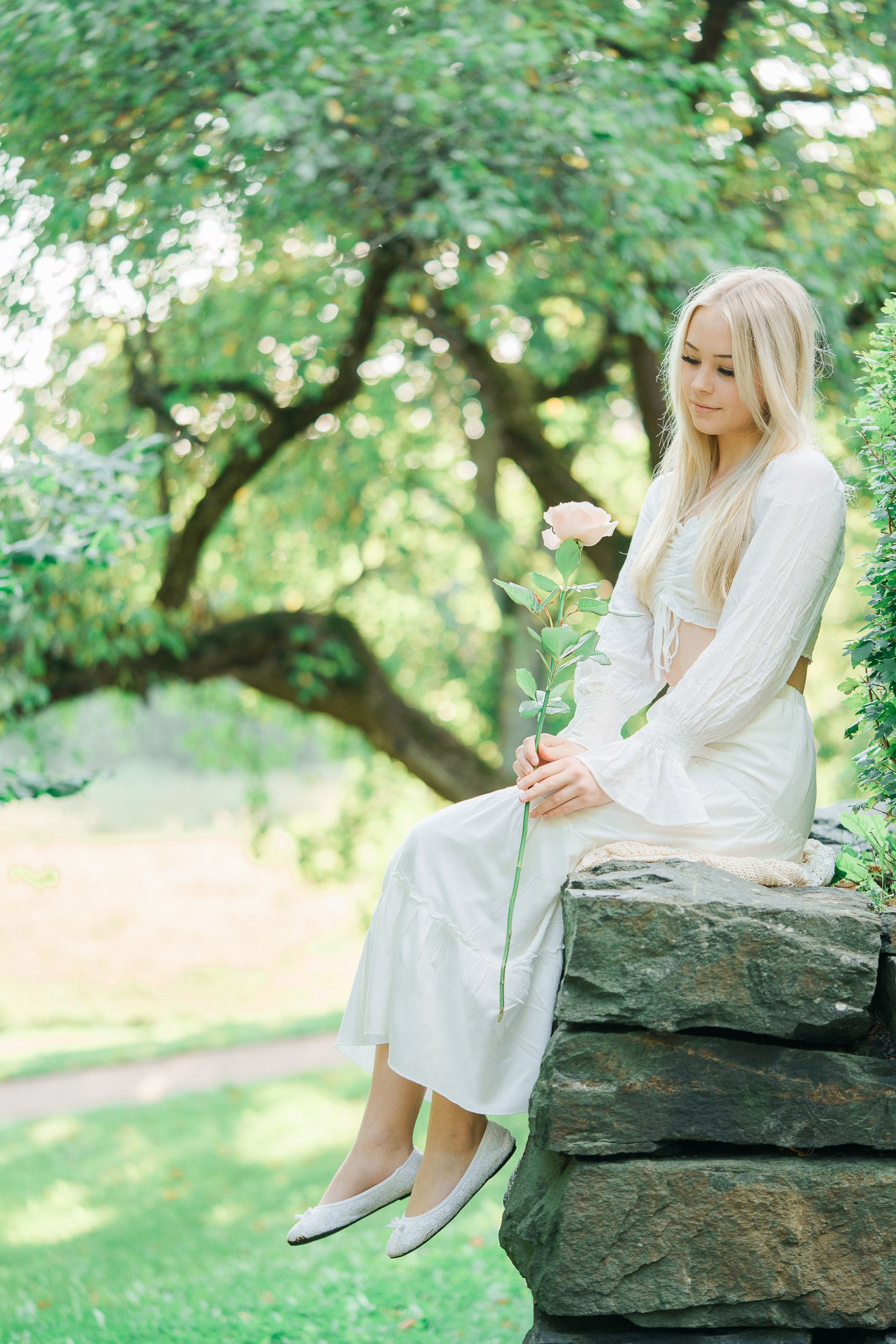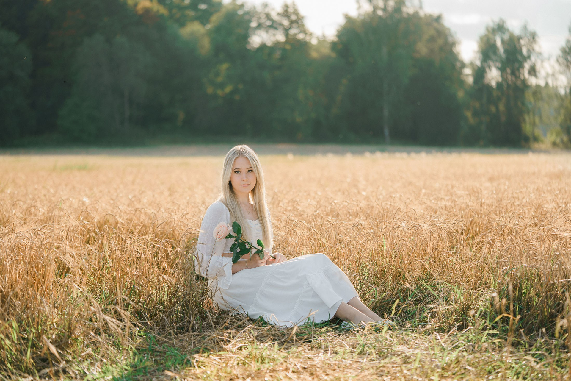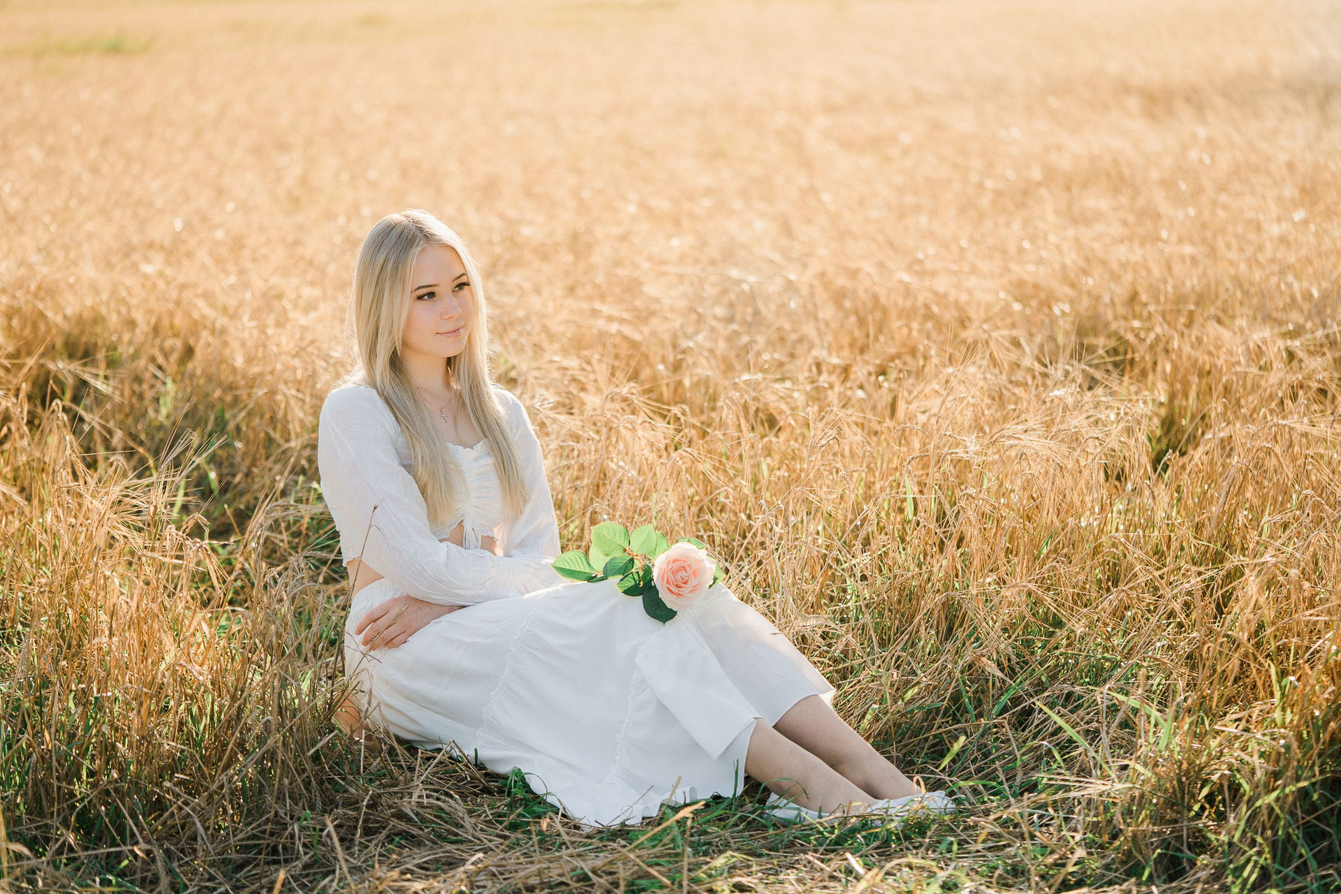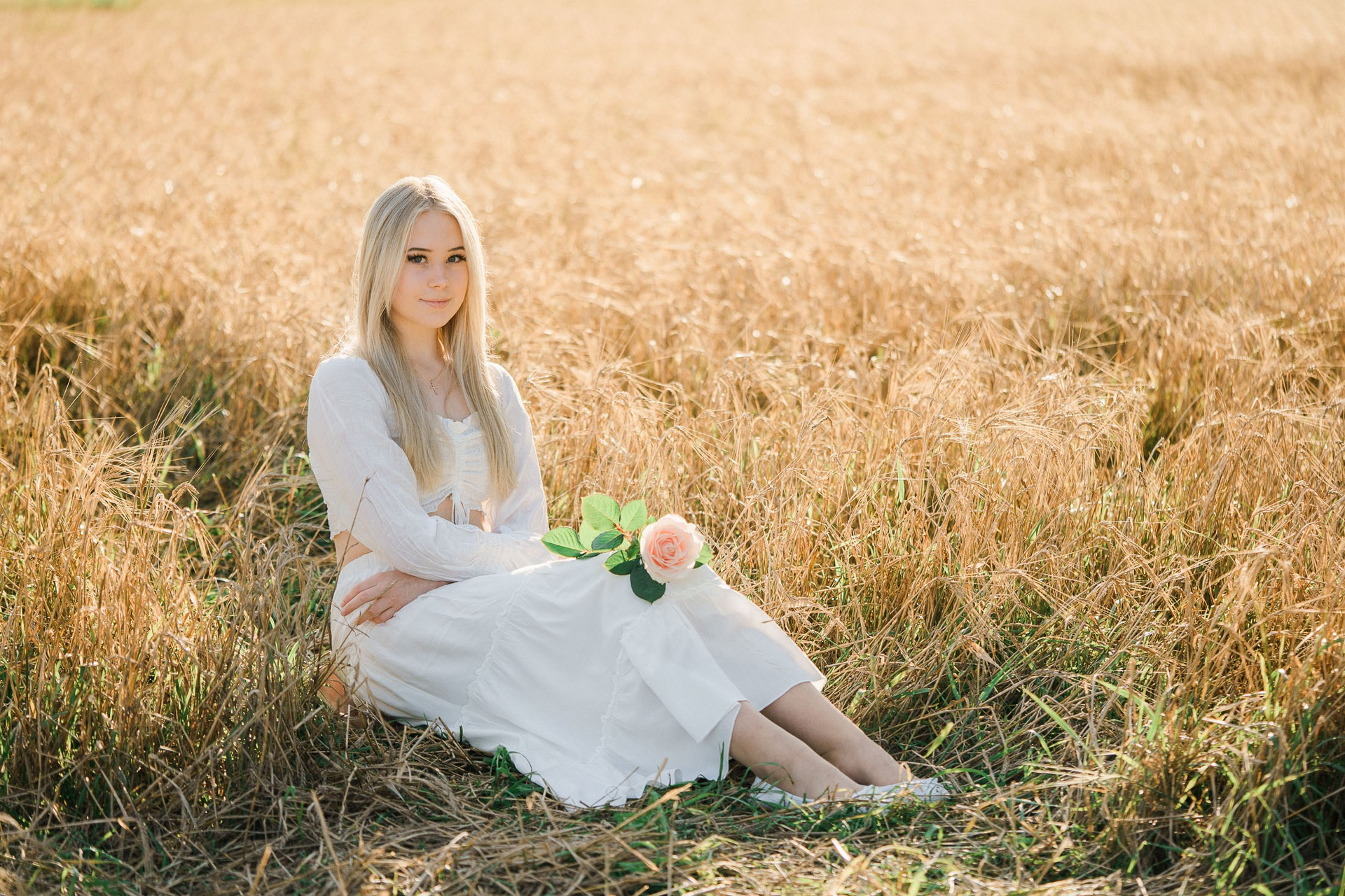 Aloitimme kuvauksen kartanon vanhojen, vehreiden puiden katveessa ja joen rannalla, jossa valkoinen penkki ja veden tyyneys toivat kuviin ihanan rauhallisen tunnelman. Sieltä siirryimme avarampiin maisemiin kultaisena hehkuvaan viljapeltoon. Rippilapsen kaunis, puhtaan valkoinen asu ja herkkä ruusu kädessä sopivat tähän maalaisromanttiseen ja ajattomaan miljööseen täydellisesti.
