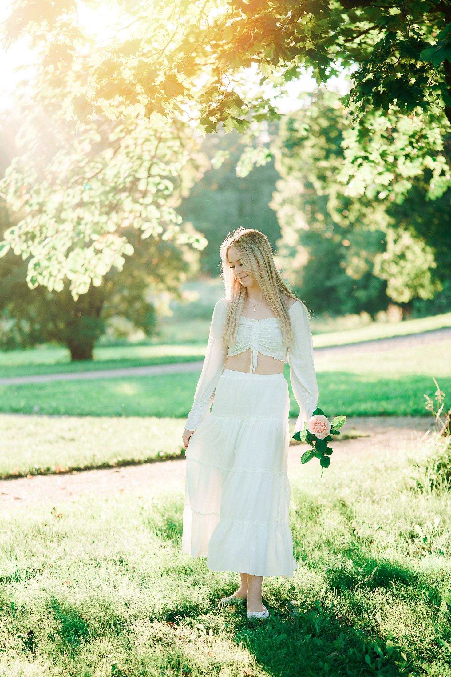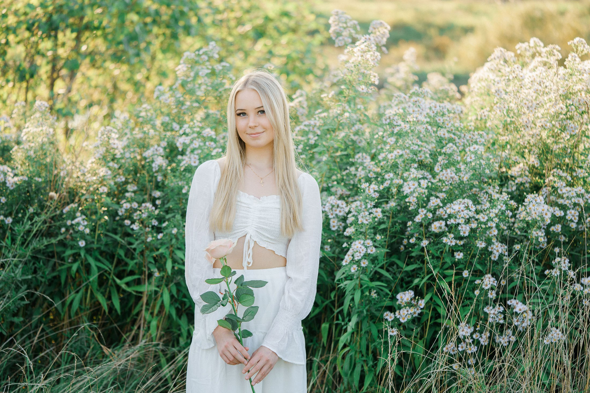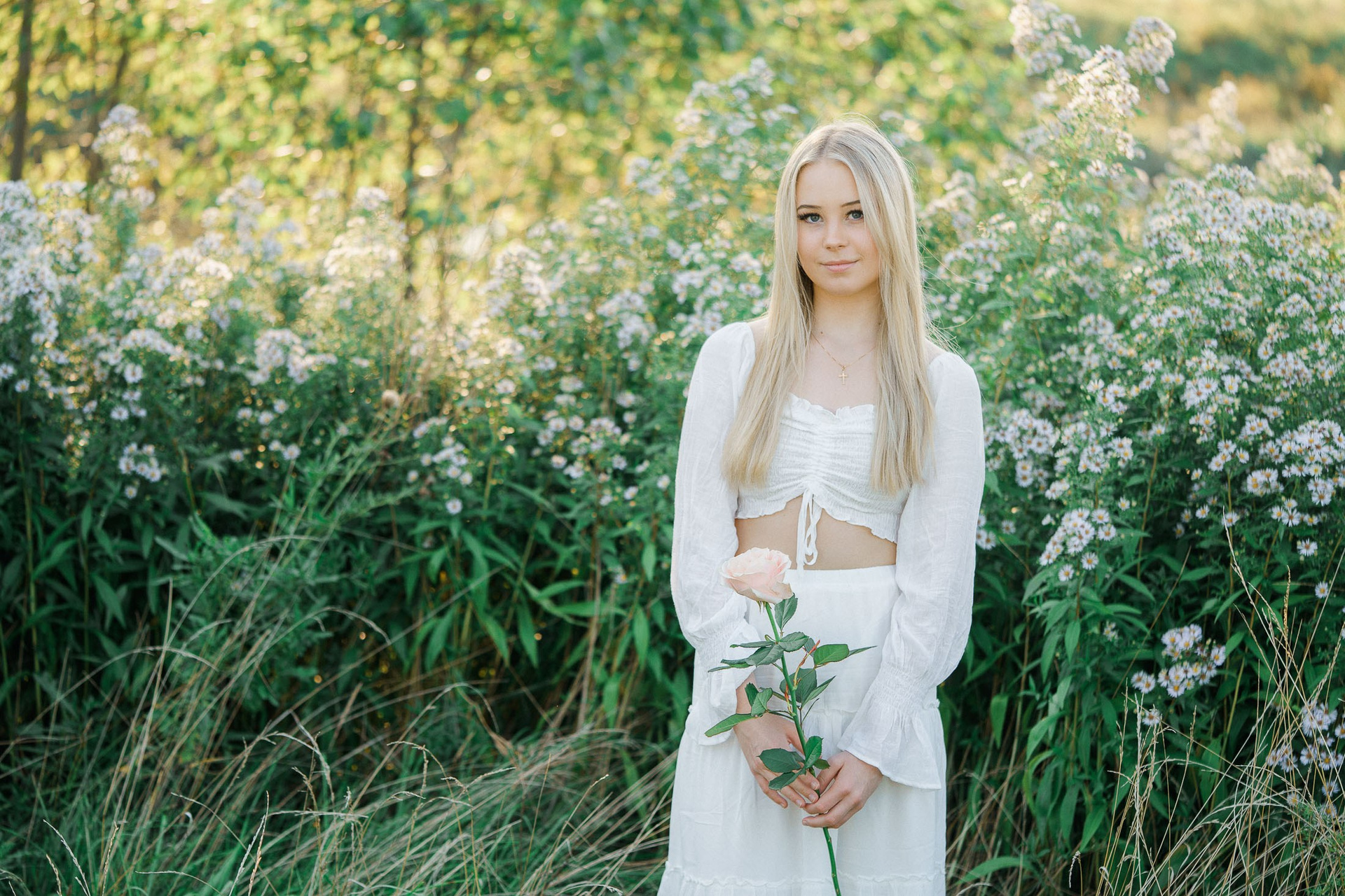 Aloitimme kuvauksen kartanon vanhojen, vehreiden puiden katveessa ja joen rannalla, jossa valkoinen penkki ja veden tyyneys toivat kuviin ihanan rauhallisen tunnelman. Sieltä siirryimme avarampiin maisemiin kultaisena hehkuvaan viljapeltoon. Rippilapsen kaunis, puhtaan valkoinen asu ja herkkä ruusu kädessä sopivat tähän maalaisromanttiseen ja ajattomaan miljööseen täydellisesti.