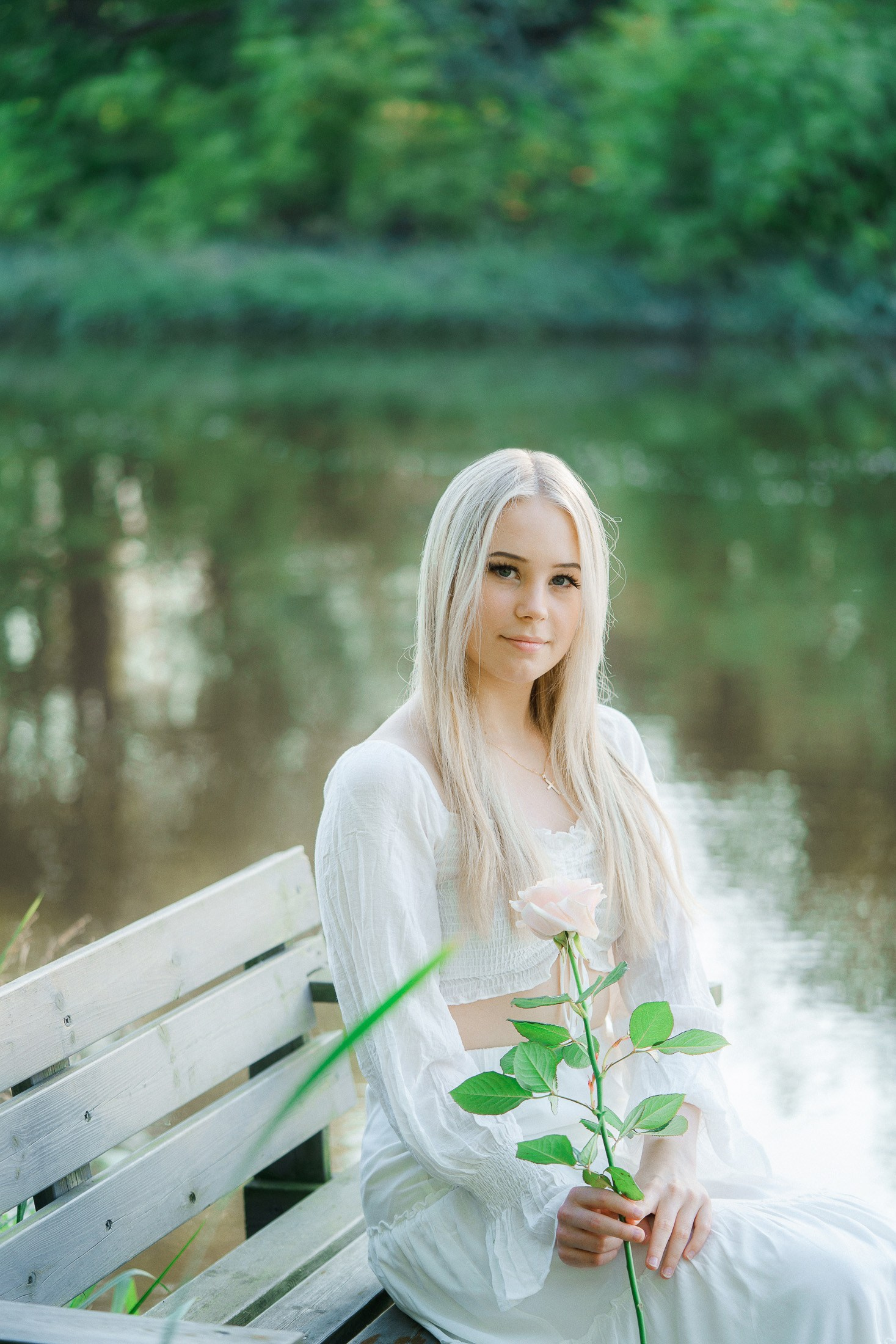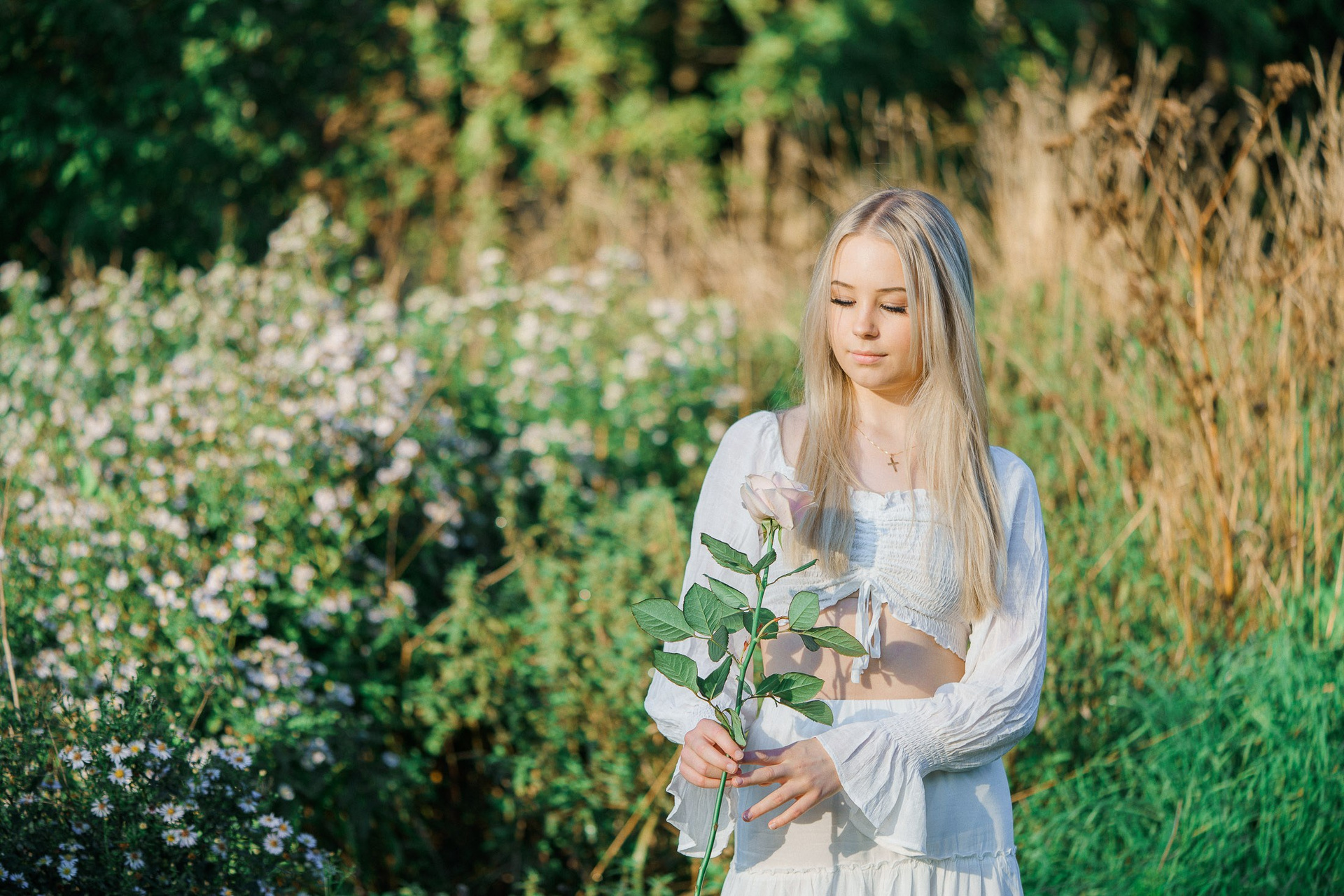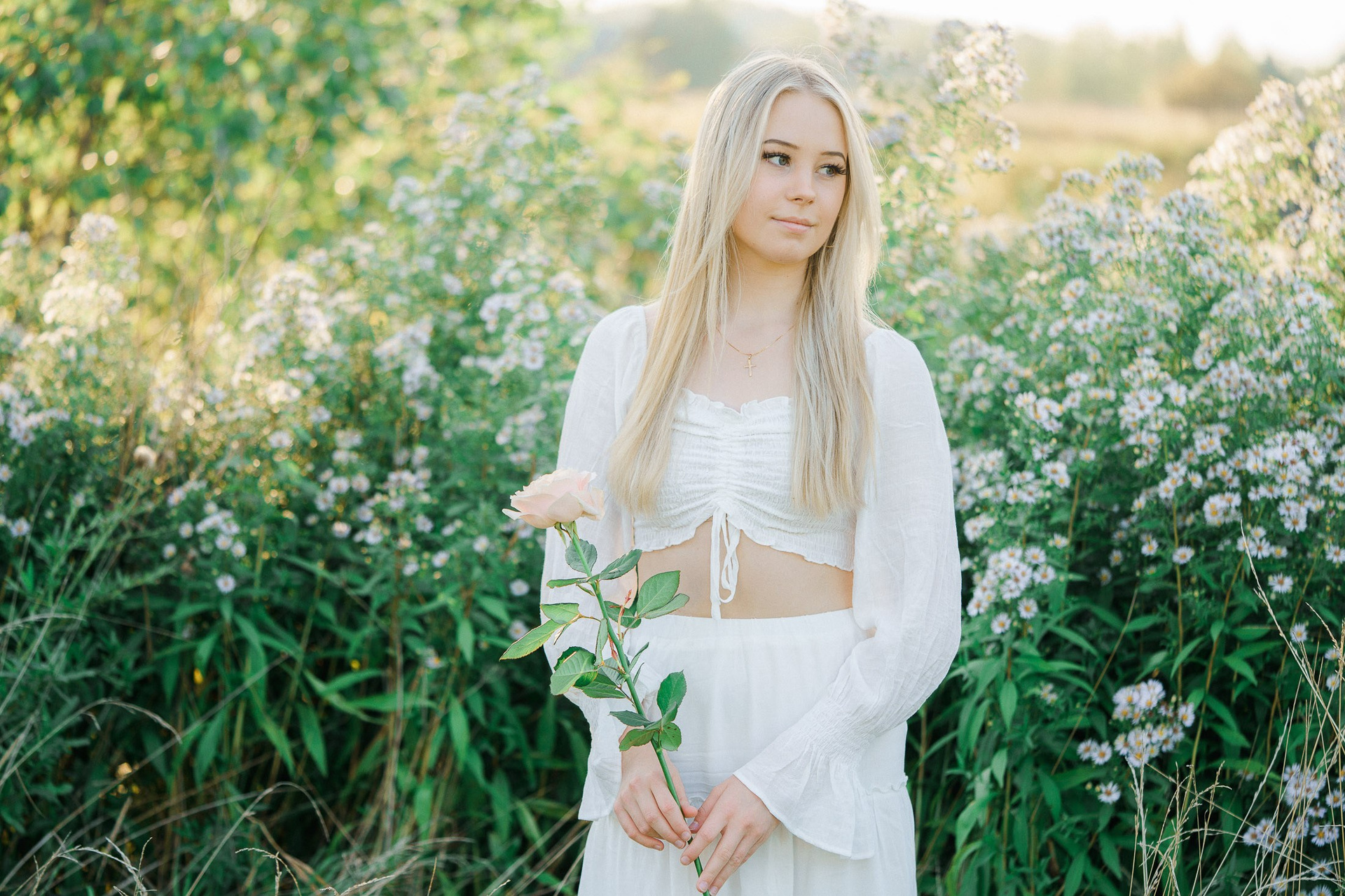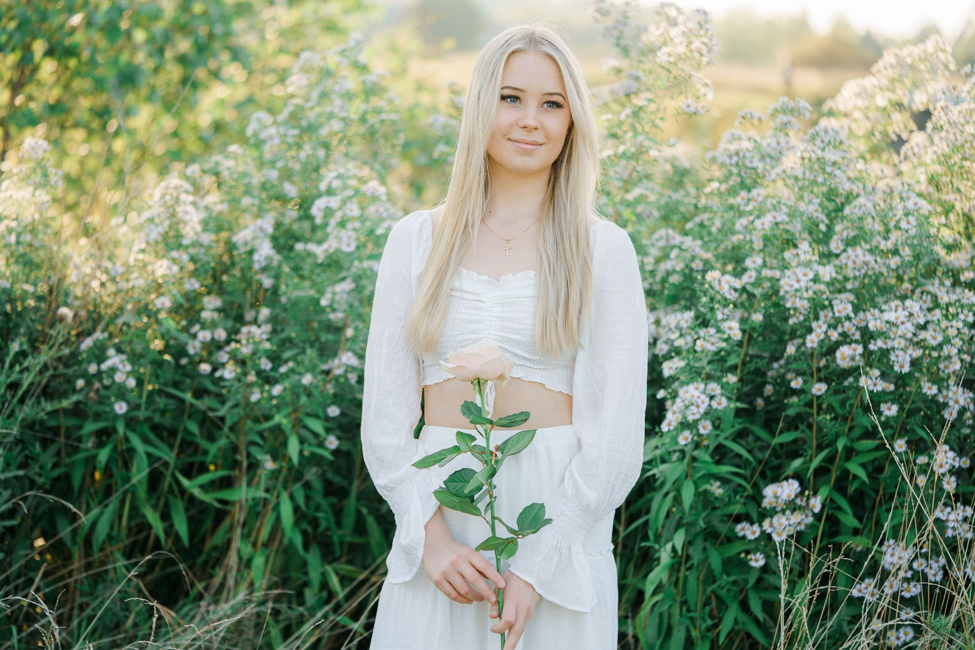 Aloitimme kuvauksen kartanon vanhojen, vehreiden puiden katveessa ja joen rannalla, jossa valkoinen penkki ja veden tyyneys toivat kuviin ihanan rauhallisen tunnelman. Sieltä siirryimme avarampiin maisemiin kultaisena hehkuvaan viljapeltoon. Rippilapsen kaunis, puhtaan valkoinen asu ja herkkä ruusu kädessä sopivat tähän maalaisromanttiseen ja ajattomaan miljööseen täydellisesti.